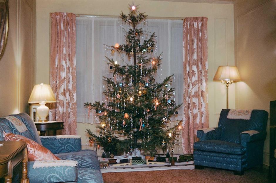 With plenty of clashing patterns on the sofa, curtains and cushions, the towering tree in this 1960s sitting room just about stands out as the focal point! The fir is festooned with tinsel, which is meant to mimic dangling icicles.