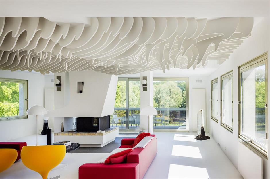 The ceiling in the living room is like a sculpture in itself, adding to the feeling of being somewhere in the future.