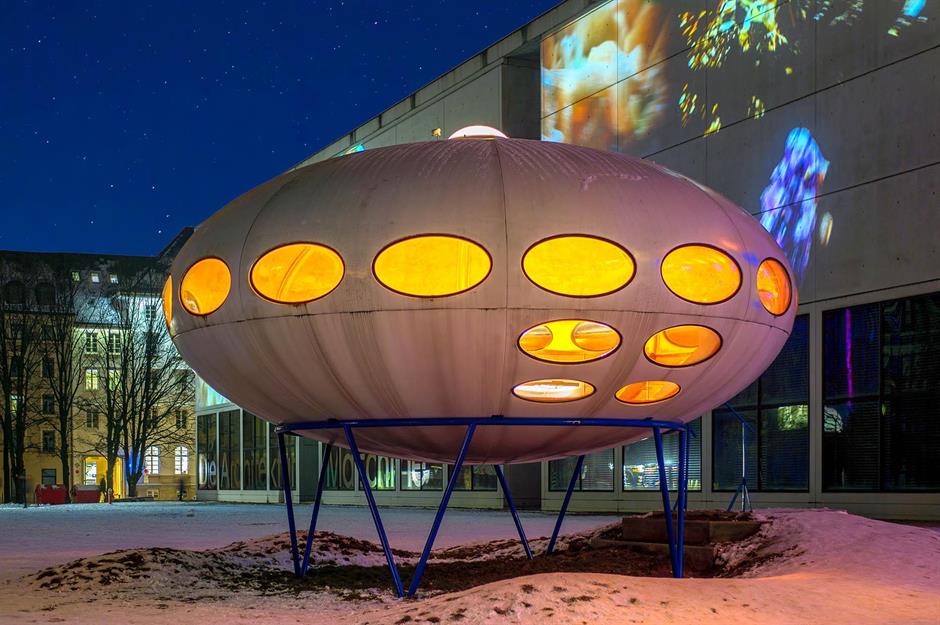 This Futuro house prototype stands in front of the Pinakothek der Moderne museum in Munich, Germany. When this pod was restored, it was given a door that could open and close electronically at the touch of a button – the perfect way for a spaceman to make a grand arrival on planet Earth.