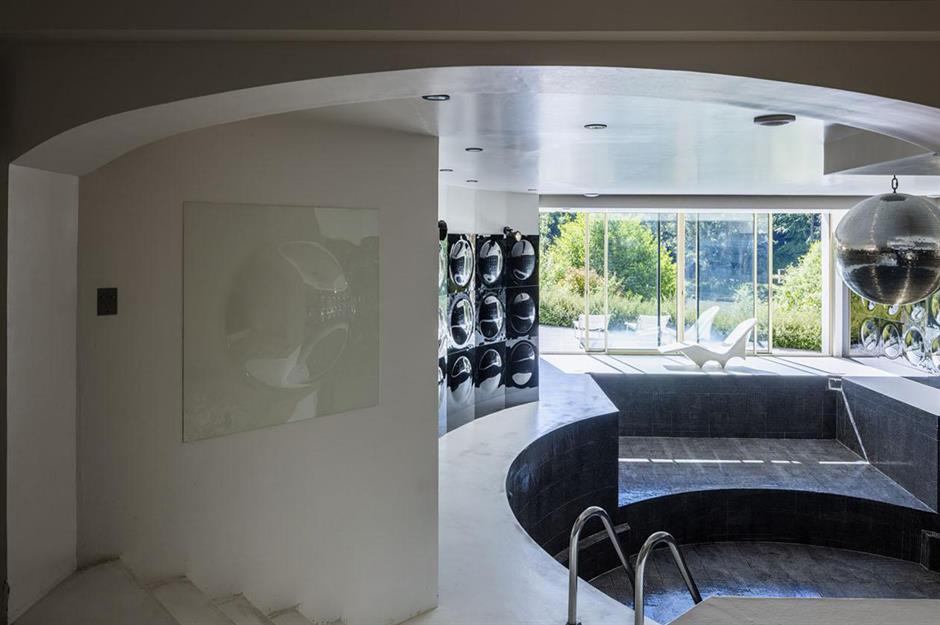 Inside, the living area features a curved wall of windows providing plentiful views across the terrace, pool and mountain views from a sunken area perfect for a party. The steel beaker-shaped fireplace hood and floating hearth are the futuristic centrepiece of the home.