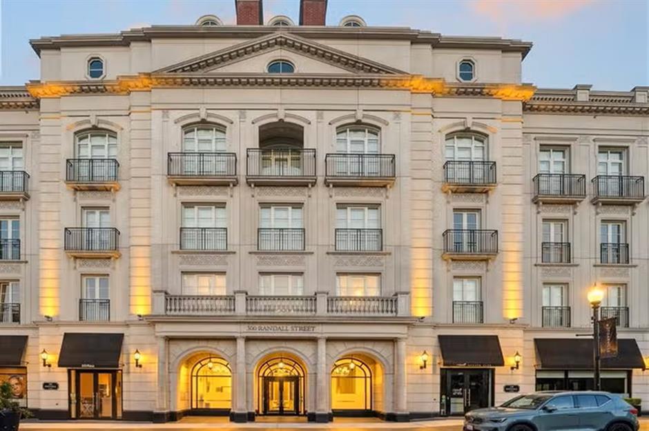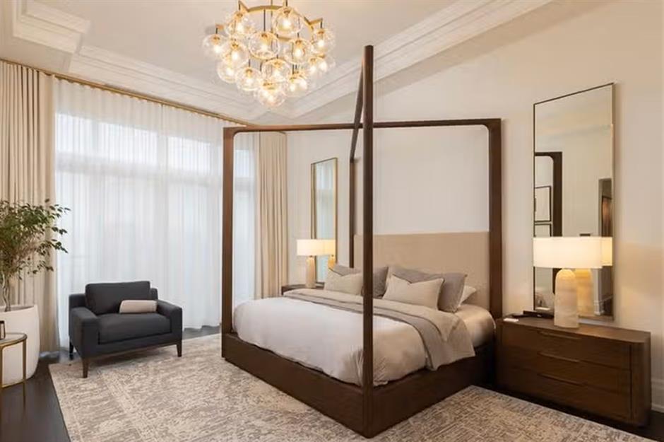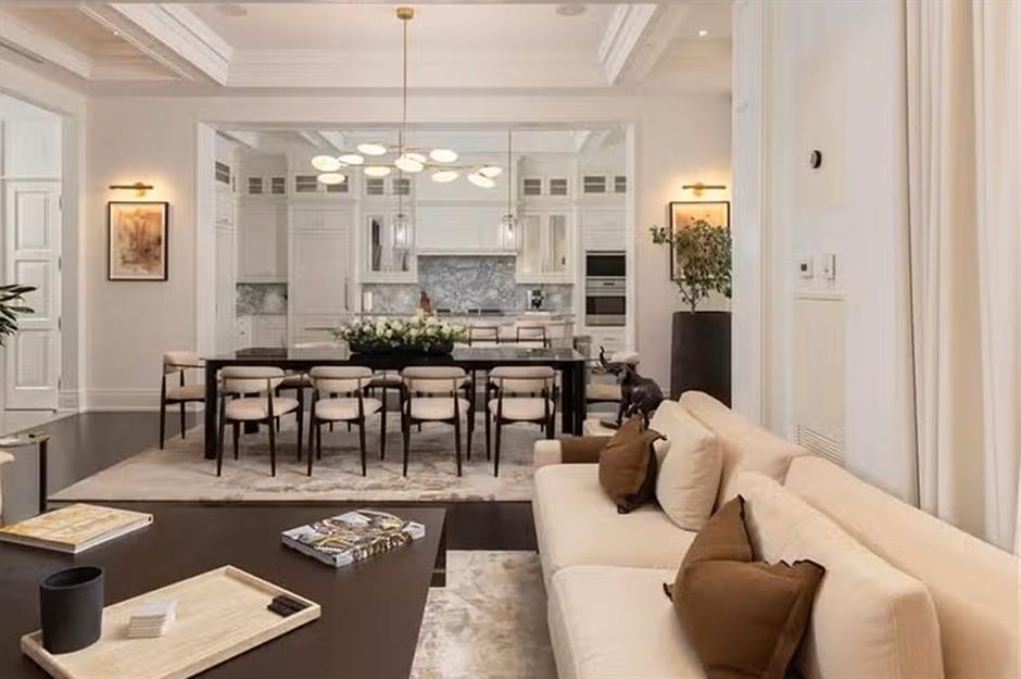 The two-storey pad measures between 3,000 square feet (279sqm) and 3,249 square feet (302sqm) and features an open-concept interior. There’s a sleek chef’s kitchen with Bosch appliances, a formal dining room with curved windows and a lounge with a huge marble-clad fireplace.