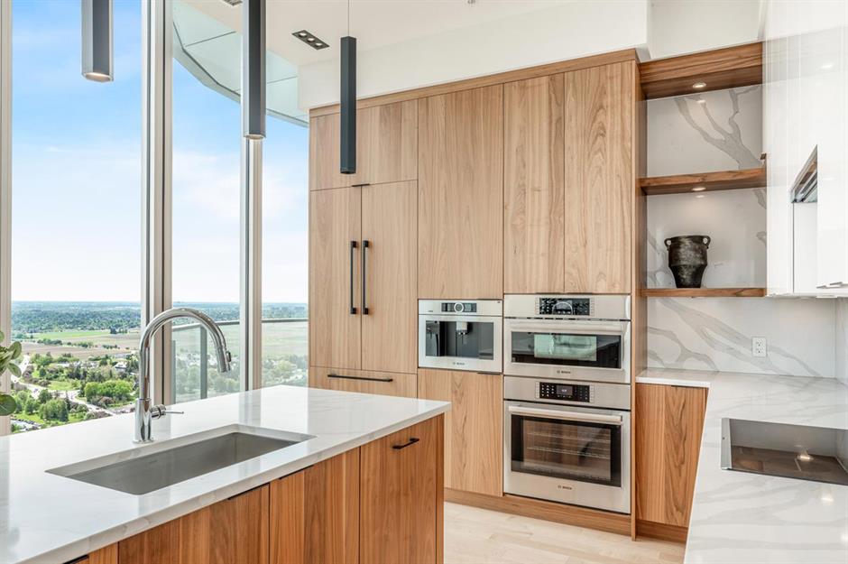 The skyscraper was designed by Hariri Pontarini to reflect the rippling waters of nearby Dows Lake, while the interior apartments all face the view, with floor-to-ceiling windows for unobstructed scenery. Of course, this penthouse enjoys the best views in the building.