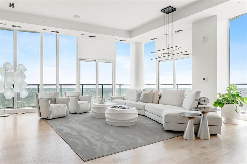 Finished with floor-to-ceiling windows that provide 360-degree views across the city, this space offers the perfect wow-factor welcome. The home also boasts a private office with a wine closet, as well as five bedrooms and three bathrooms.