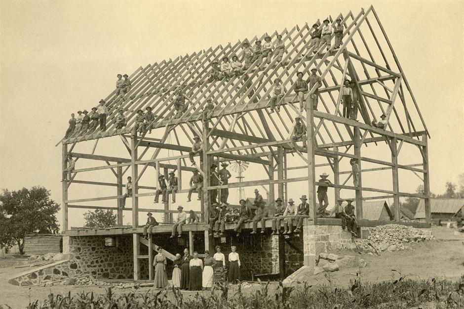 Barn raising, too, is done entirely by hand in a famous Amish tradition generally requiring hundreds of men.