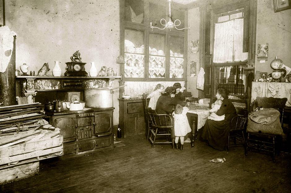 This striking image shows Mrs Mary Caperale and her daughters picking nuts in the cramped kitchen of their tenement apartment at 141 Hudson Street, New York.