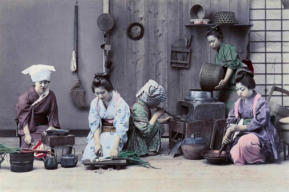 1880 to 1890: preparing dinner in a Meiji-era kitchen