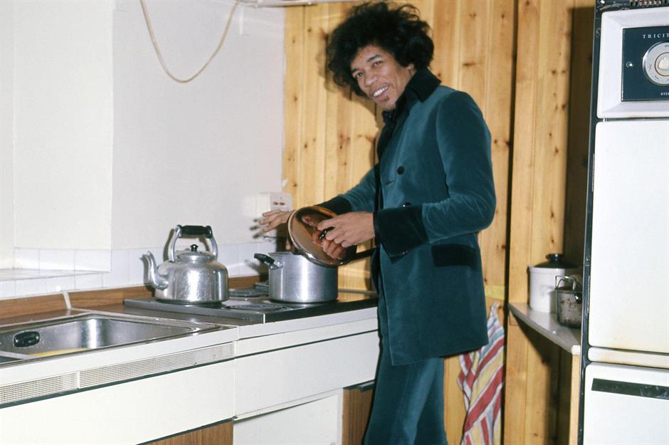 Photographed in 1967, Jimi Hendrix is seen at the cooker in the small kitchen of his London flat. That year, he became a sensation in Britain, releasing Are You Experienced with his band The Jimi Hendrix Experience and scoring UK top-three hits with 'Purple Haze' and 'The Wind Cries Mary'.