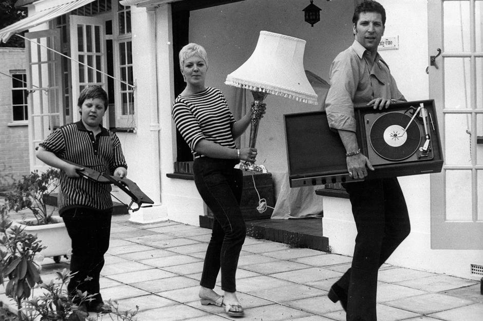 This humorous photograph shows singer Tom Jones with his wife, Linda, and their son, Mark, as they carry belongings into their new Surrey home.