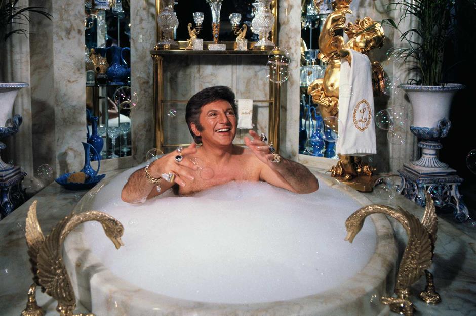 Taken for a television special, this photograph shows Liberace playfully spoofing his daily routine as he soaks in a £40,700 ($55k) marble bathtub. Known for his virtuoso piano skills and trademark candelabra, he also embraced a lifestyle of flamboyant excess both on and off stage.