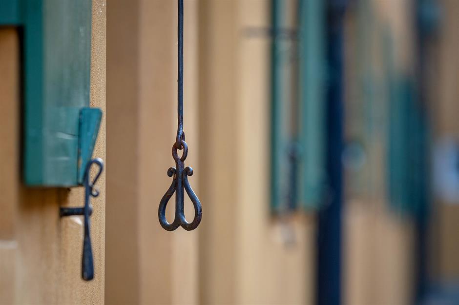 The streets of the Fuggerei are filled with historic idiosyncrasies that may not immediately make sense to contemporary eyes. A particularly unusual fixture is the metal bell pulls installed outside the front doors of the apartments, some of which are still operational. Each design is unique to the home.