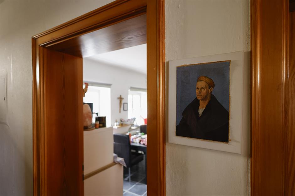 Alongside the religious iconography that decorates Martha's home, a portrait of Jakub Fugger hangs prominently in the hallway. The presence of the Fuggerei's philanthropic founder is still keenly felt by current residents – a bronze bust of the businessman even presides over one of the town squares.