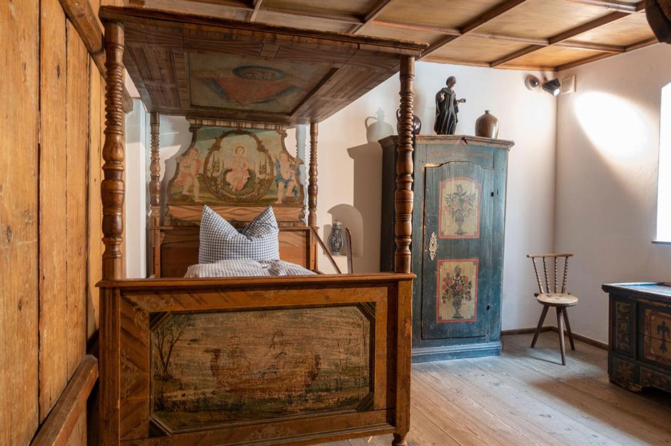 Elsewhere in the apartment, this recreation of a 16th-century bed chamber features a coffered wooden ceiling and a four-poster canopy bed, adorned with elaborate illustrations of religious icons.