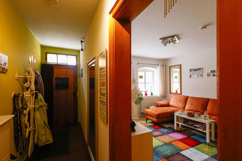 Martha's compact ground-floor apartment has a similar floor plan to the town's original 16th-century lodgings, but it's perfectly equipped for modern living. The lounge features an orange corner sofa and a colourful patchwork rug, and the hallway includes space-efficient storage for hanging coats and outerwear.
