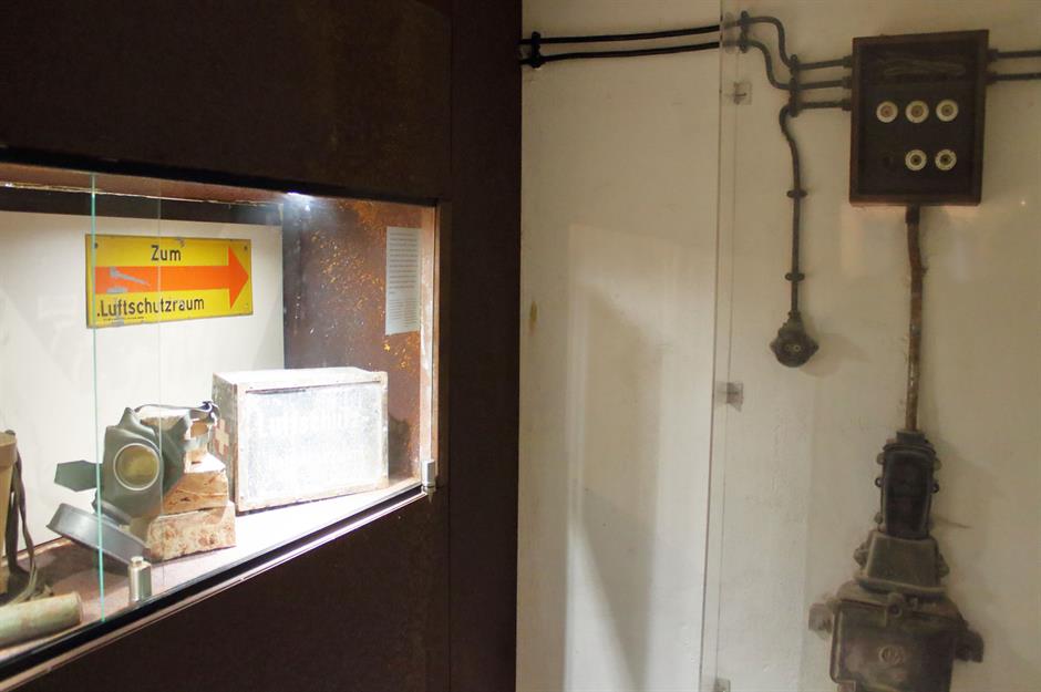 Inside, the sprawling concrete bunker features a fortified entrance door with a gas seal to keep out airborne toxins. The space still includes pipework and fixtures from its time as an active air-raid shelter, but it's since been turned into a museum that explores the impact of the war on the Fuggerei. Original items from the period are on display, including gas masks, equipment, and old signage.