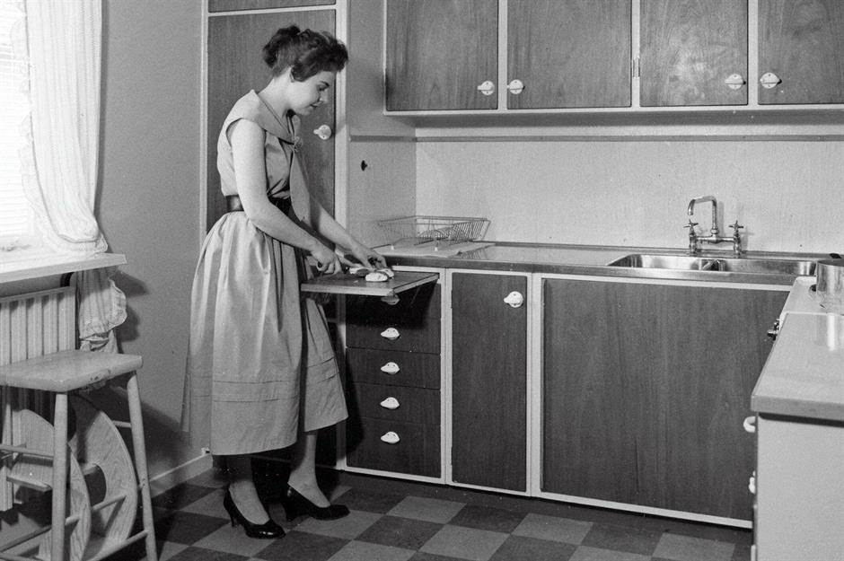 Fitted kitchens were becoming standard in the 1950s, but storage was often tight, so designers came up with clever space-saving solutions. Extendable cutting boards, which slid neatly out from beneath the countertop, provided an instant surface for slicing bread or preparing vegetables without taking up precious workspace.