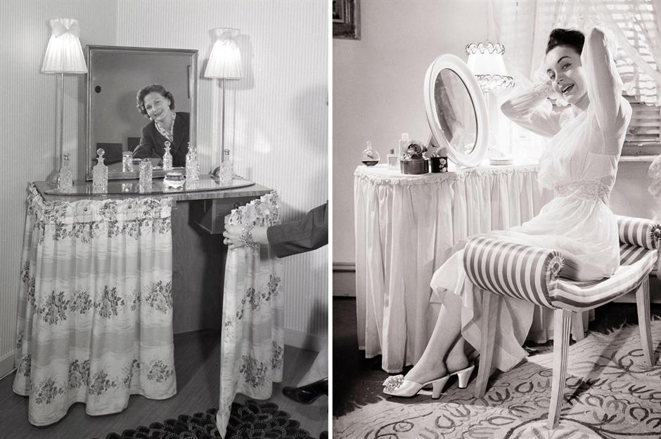 In the 1950s, a dressing table draped in fabric was the height of bedroom elegance. Often trimmed with frills or floral skirts, these vanities hid practical storage beneath and doubled as a stage for perfume bottles, hairbrushes, and powder compacts.
