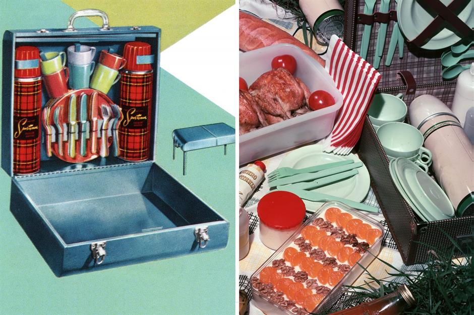 Often paired with tartan Thermos flasks and neatly packed into sturdy hamper cases designed with straps and different sections for cutlery and even condiments, these sets captured the cheerful, practical spirit of post-war family life.