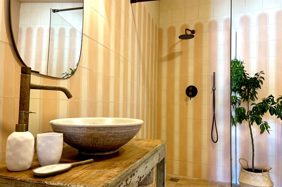 The Jack and Jill style bathroom now features pretty pink handcrafted tiles sourced from Bert & May, a walk-in shower, and a large mirror.