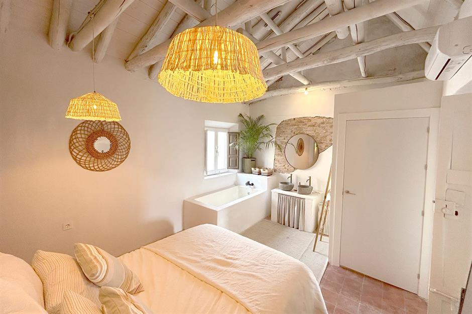 The Ibiza room at the top of the property has a crisp, minimalist aesthetic, softened by painted old beams and bare brick, which gives it a modern, laid-back atmosphere.