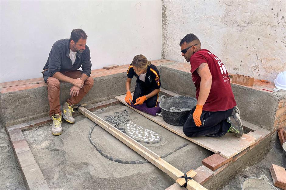 Here, Amanda can be seen working on a pomegranate mosaic on the terrace floor with series building consultant Scott Thompson and local builder Rafa.
