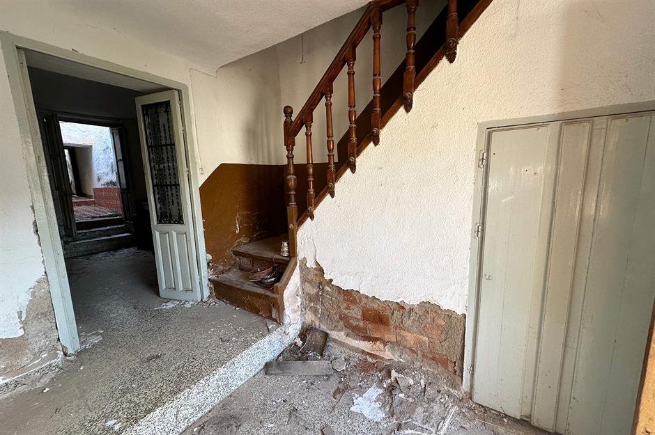 The production company bought the house, and Amanda and Alan, together with a team of contractors, set about restoring it. However, it wasn't just the outside that needed serious attention. This photo shows the ground floor, with stairs leading up to the first floor, but it’s all in a rather sorry state.