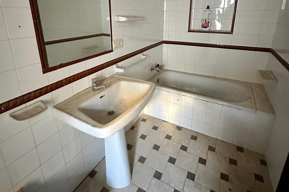 This ‘before’ picture of one of the two bathrooms shows just how drab the interiors were to begin with. Bland and pokey, boring white tiles dominate the space, and the built-in bath and pedestal basin are absolutely filthy.