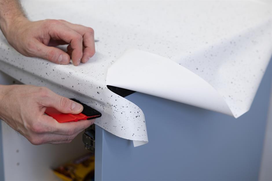 Many wraps are heat-resistant, removable, and self-adhesive, so all you need to do is prepare your worktops and lay the vinyl. It can be fiddly, especially when working around a sink or corners, but online tutorials will help you get the job done right.