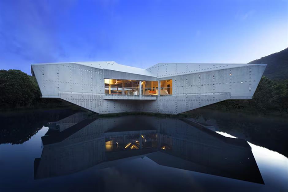 The spacecraft-like structure cantilevers out from the shoreline thanks to an innovative and complex design, giving the impression that it is floating on water.