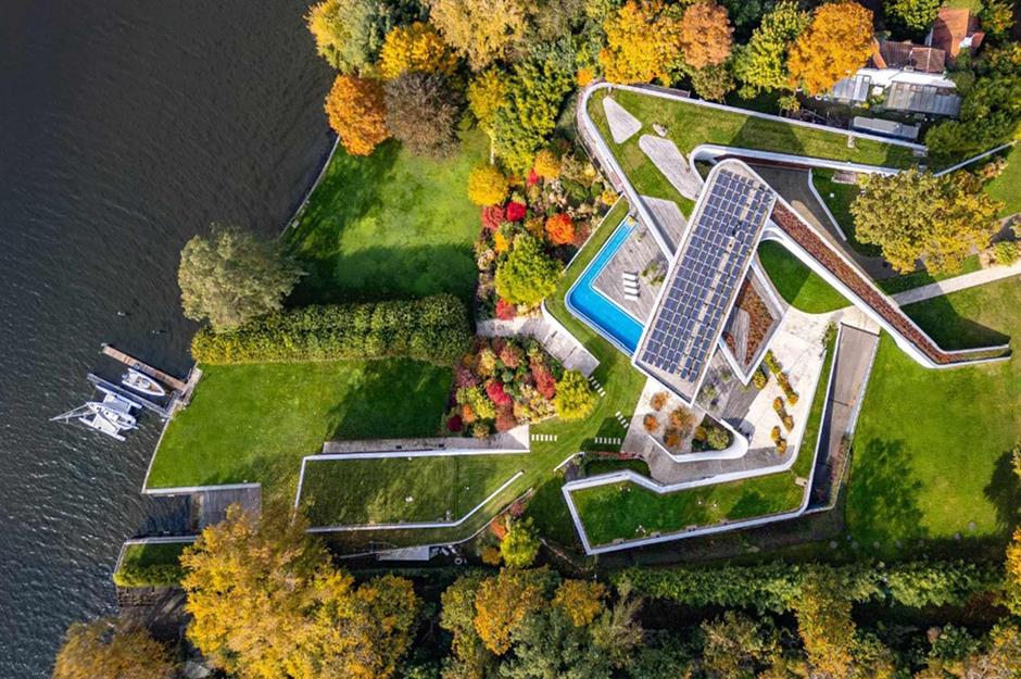 Positioned next to the water on Schwanenwerder, a scenic island in southwestern Berlin, the home comes complete with a jetty and slipway, as well as a stretch of private waterfront.