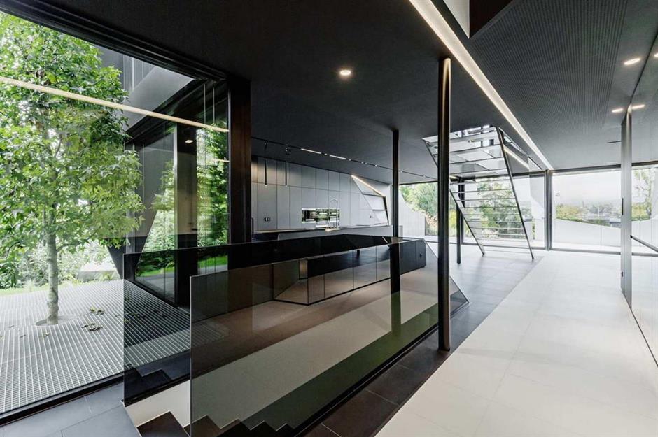 Arranged over four floors, the front of the house features hardly any windows, yet around the back, you'll find large, angular windows and a full-height glazed wall on one side, which provides views of an outdoor courtyard.