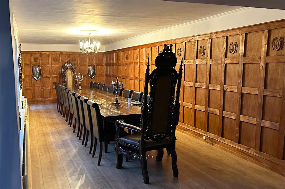 Peter also installed the rich, atmospheric wood panelling, complete with detailed coat of arms motifs that add a sense of grandeur, perfect for hosting friends and family
