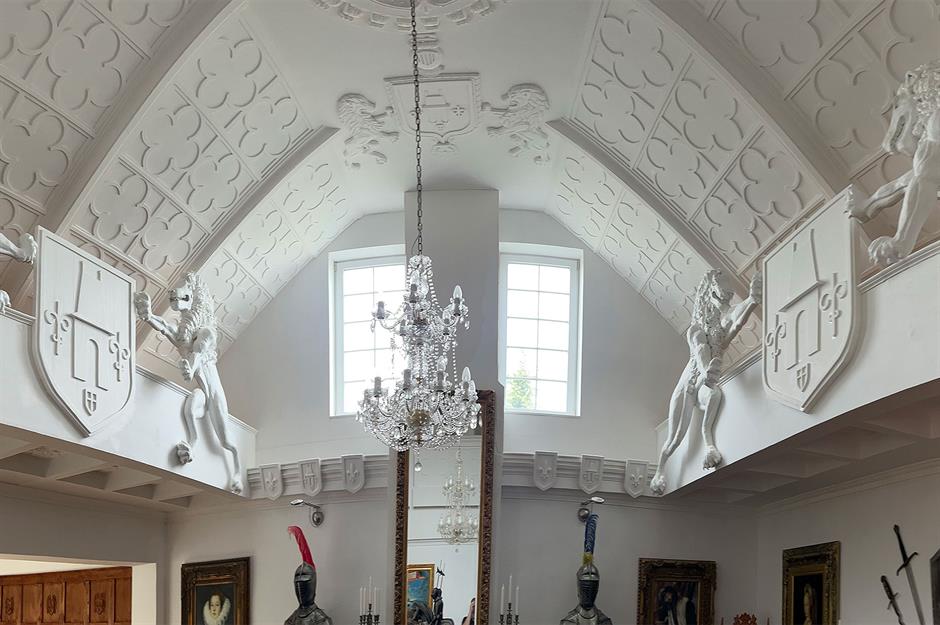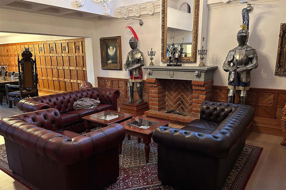Inside, there are all the trappings of a medieval castle. In the lounge, there's a stately fireplace, guarded by armoured knights.