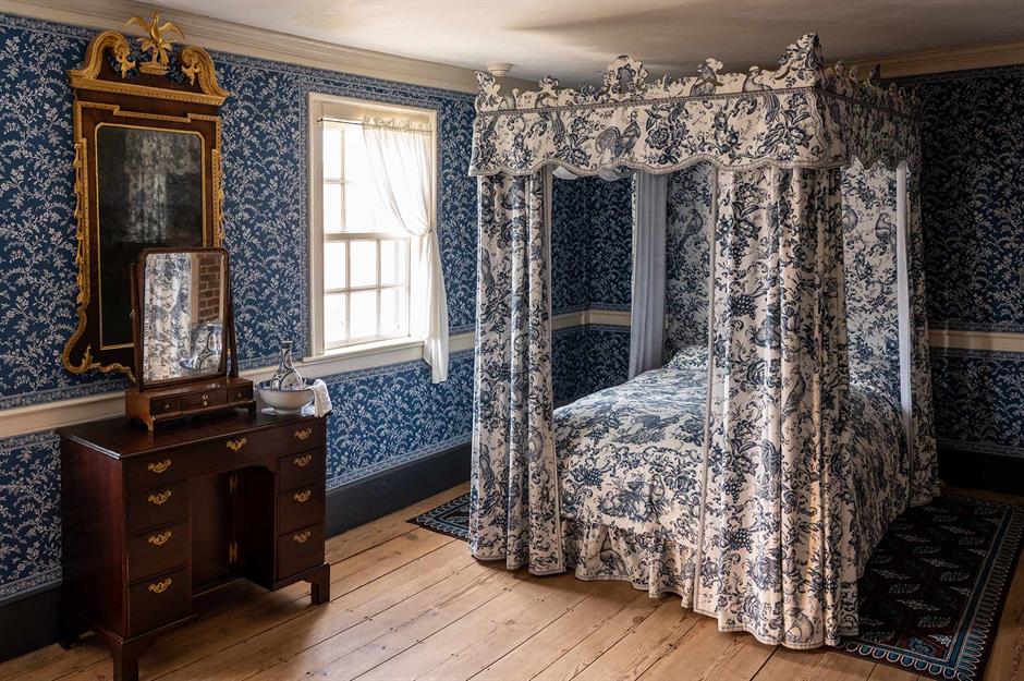 This four-poster canopy bed is the charming centrepiece for what would have been a guest room in Washington’s time, while mouldings frame the striking blue wallpaper, punctuated with antique pieces.