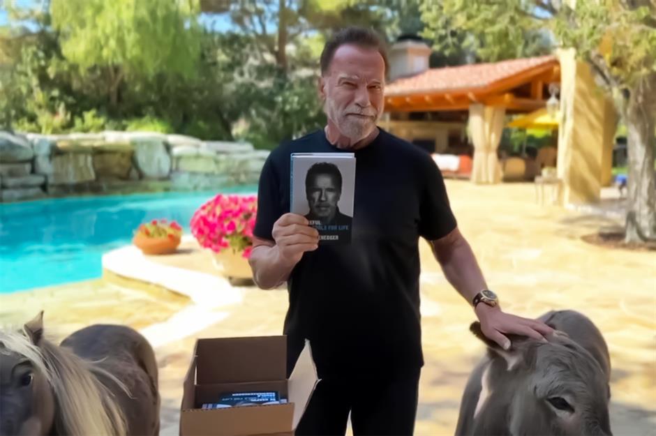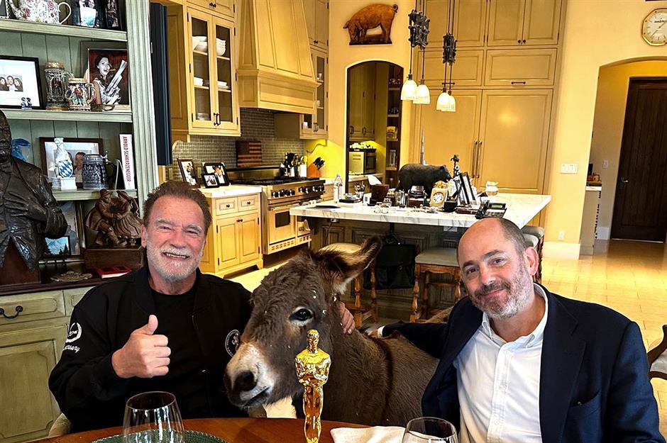 This snap of Schwarzenegger with his donkey Lulu and Oscar-winning director Edward Berger reveal a marble-topped island and wooden dresser, each cluttered with family photos, objets d'art and the comforting clutter of everyday life.