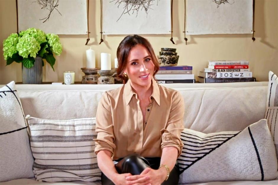 In a video message for America's Got Talent, Meghan revealed a serene sitting room styled in monochromatic tones. Throw pillows featuring minimal black geometric patterns echo the art on the wall, while a vase of hydrangeas, chunky wooden candle holders and piles of books artfully stacked on a console table soften the look.
