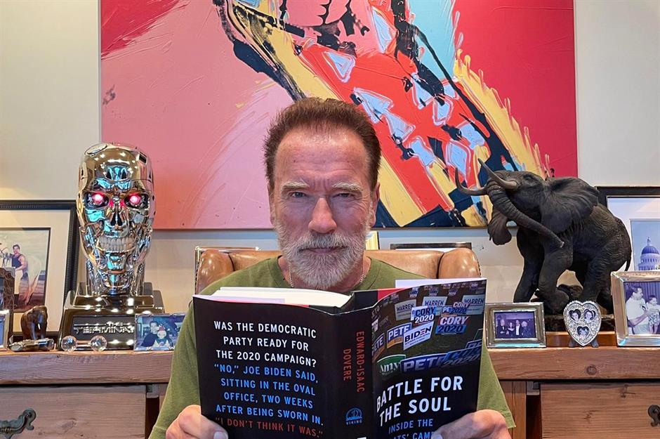 Pictured here in his office, Arnold is surrounded by film memorabilia, including the iconic face of the Terminator, as well as family photos and striking works of art.