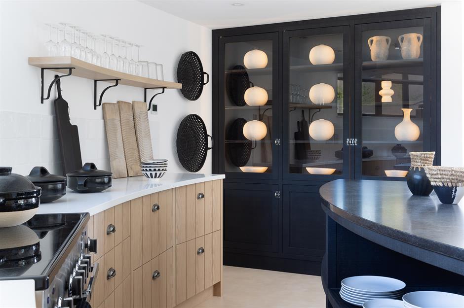Here you can see one example of how the architectural design of the building is mirrored inside, with the curve of that back wall clearly seen in the kitchen. Pippa and Scott also brought some other design features of the outside in here, including the blackened timber of the exterior, seen in the dresser and the island.