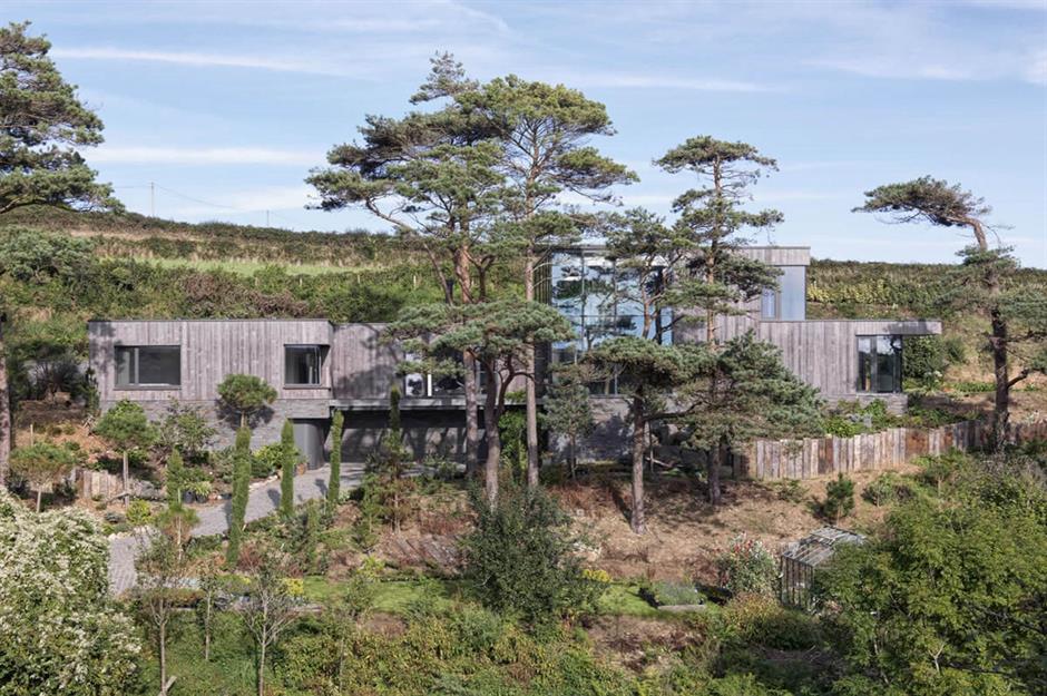 This stunning, energy-efficient home was built into the rugged hillside of an Area of Outstanding Natural Beauty in Glamorganshire, UK in December 2020. Positioned on a sloping site and nestled among mature pine trees, it captures incredible views of the Welsh countryside, all the way to the coast.