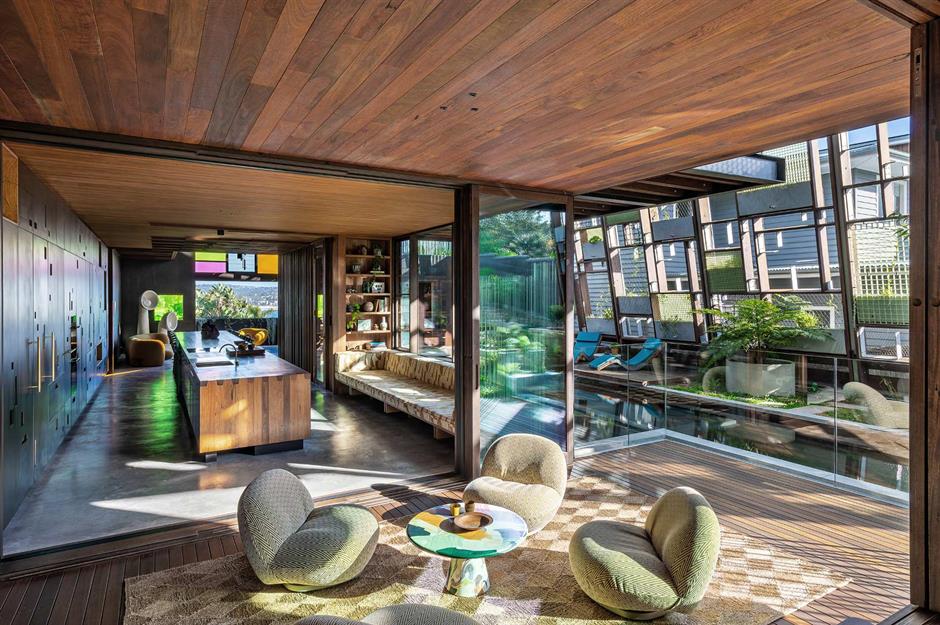 Indoor-outdoor living is the dominant theme throughout the 10,495-square-foot (975sqm) home's design. The entrance is set alongside a cascading waterfall surrounded by plants, while stained glass panels in the double-height living space frame coastal views.