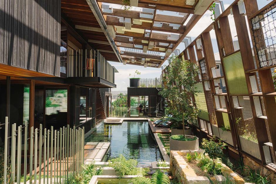 An upper-floor common room extends out onto a series of discreet balconies, making this the perfect spot for entertaining guests on cool evenings. The terraces are all protected by perforated screens that provide shade, while all the greenery inside is free to grow and climb across the different levels of the home.