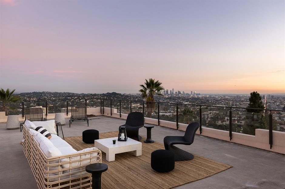 Outside, there's an expansive roof terrace where occupants can relax while taking in stunning views across LA.